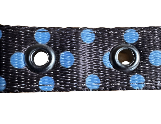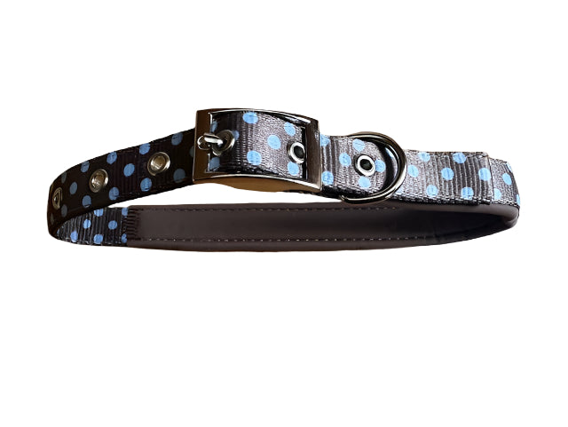 This brown and blue polka dot dog collar features a metal buckle with 7 metal-rimmed holes; to adjust to a perfect size. The collar is made from nylon and is padded at the back for added comfort.