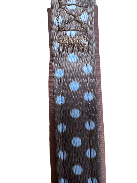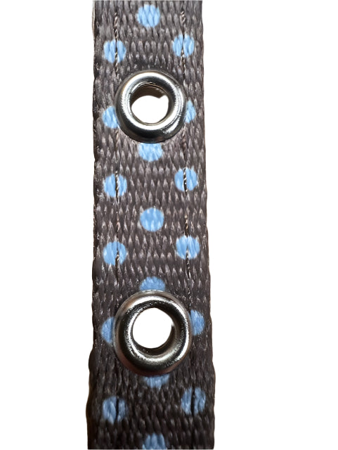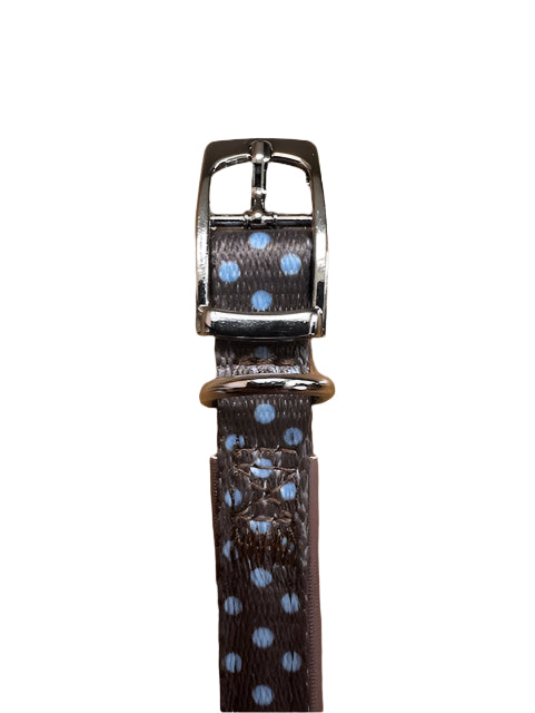This brown and blue polka dot dog collar features a metal buckle with 5 metal-rimmed holes; to adjust to a perfect size. The collar is made from nylon and is padded at the back for added comfort.
